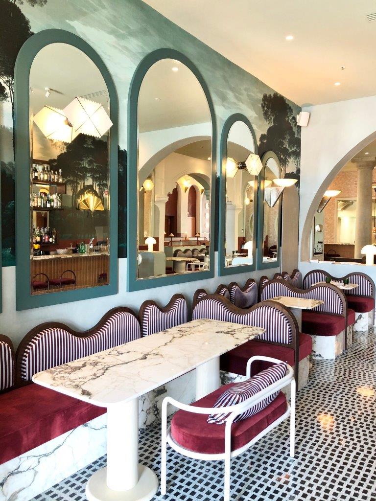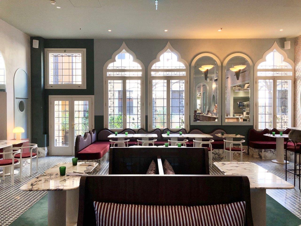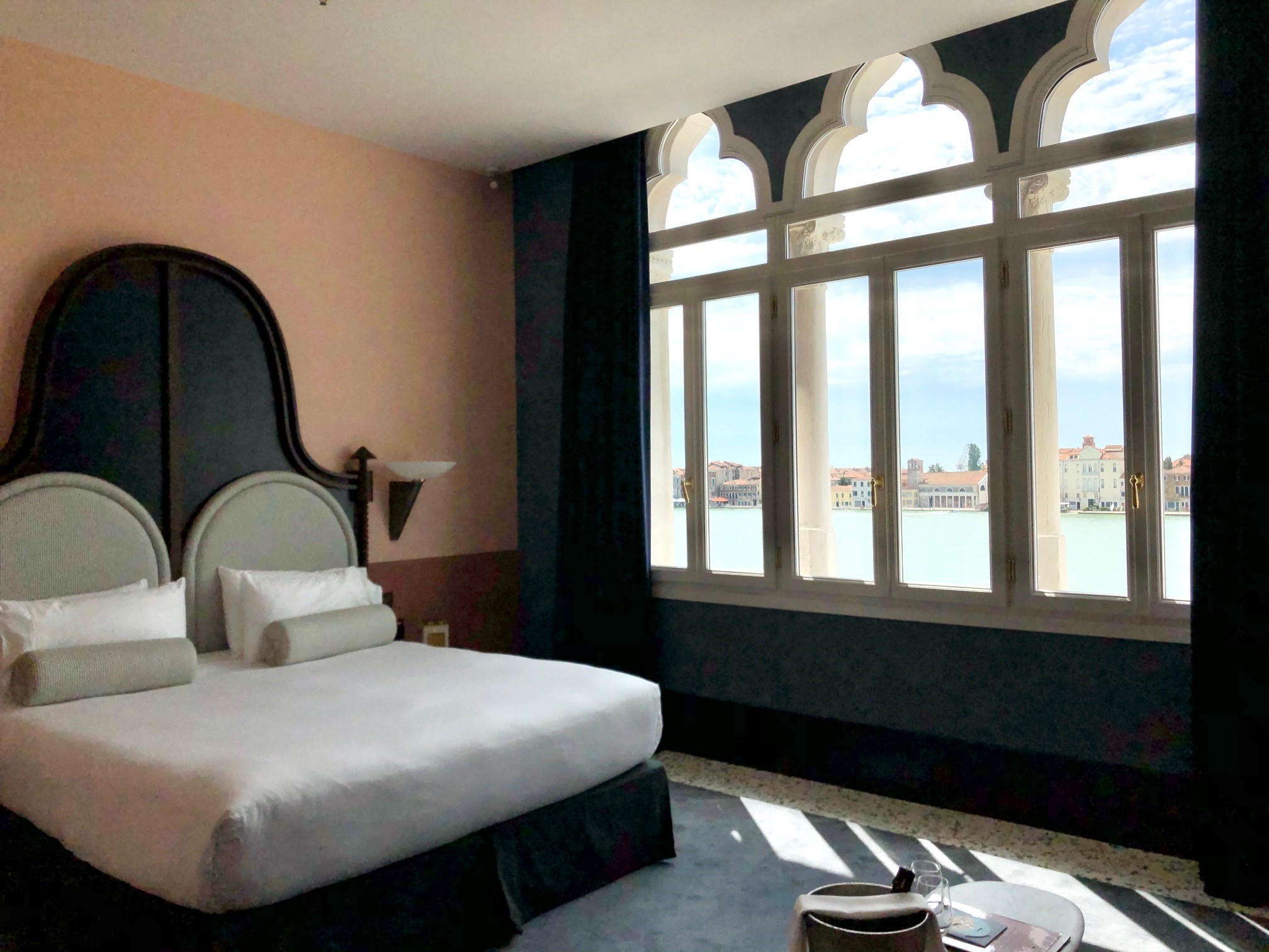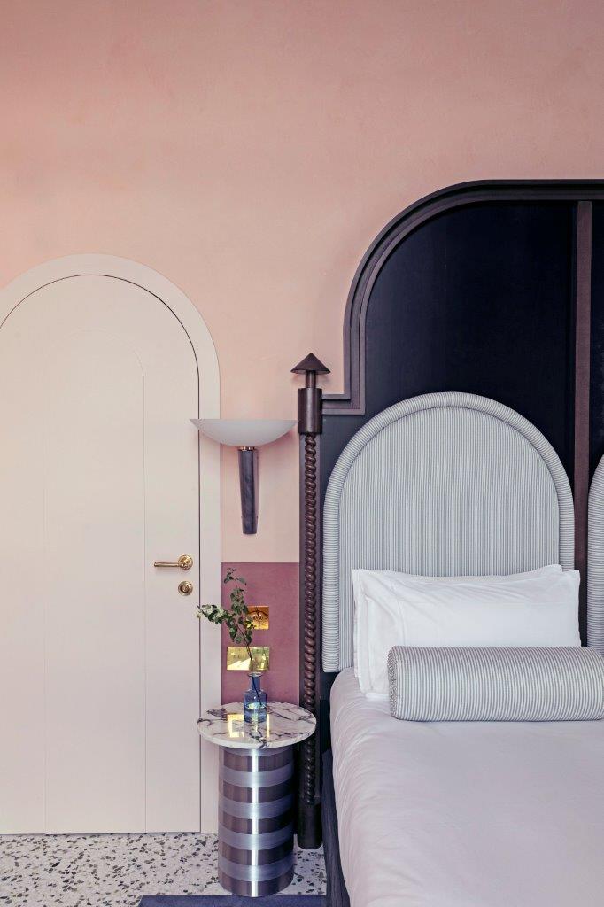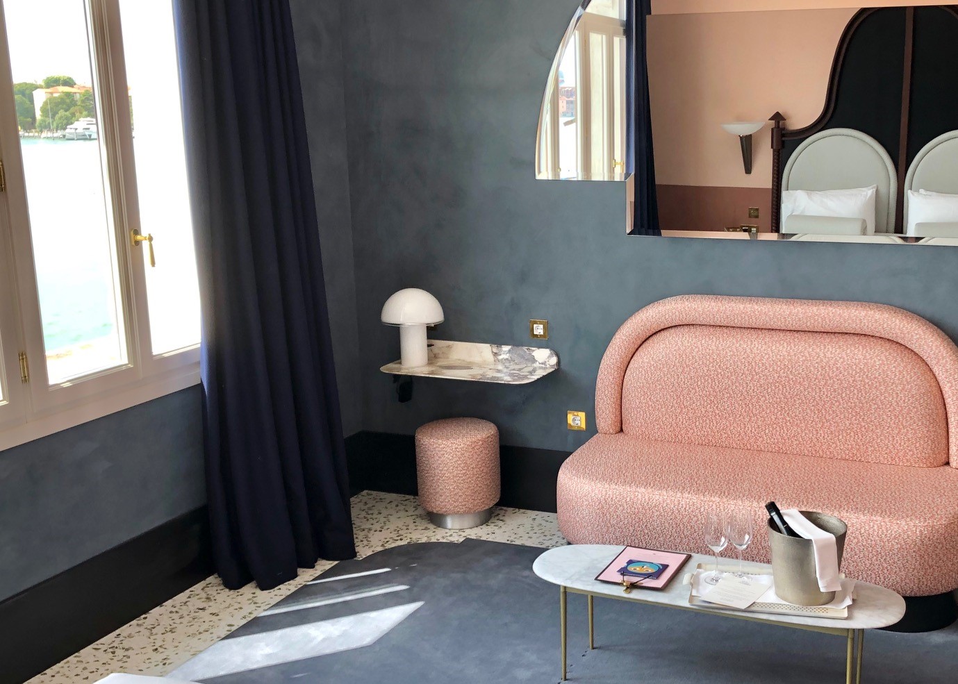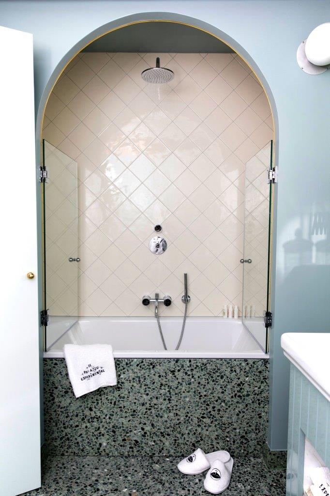 Il Palazzo Experimental has its own unique style and of course, the Venice property has interiors by French designer Dorothée Meilichzon. She was given a clean canvas from which to start, since the Adriatica building, being offices was pretty much gutted, allowing a fresh start and a new life for the building. Now there’s an Art Deco feel combined with recurring motifs from arches to stripes that remind you that you are in Venice. Whilst the ground floor public spaces are chic and elegant brought to life with the vibrant Experimental cocktail bar and popular restaurant; the guestrooms have a more pared back aesthetic. They feel classic with lots of Italian style and attention to detail, from the terrazzo floors to the bijou bathrooms that are a delight. Expect lots of playful touches too like the candy coloured sofa and also bold stripes that frame the guest room doorways – making you feel you are enjoying an Adriatic Lido holiday. The door knocker, in the shape of an anchor might just be a step too far in the direction of pastiche, it at least shows the hotel does not take itself too seriously. The Do Not Disturb sign plays with the notion of the Venice mask – this is a place to have fun.