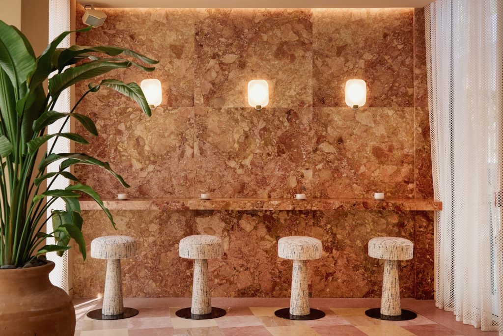 The redesign by ADC Atelier respects the hotel’s original character while introducing a fresh, contemporary warmth. Historic elements, including the 18th Street façade and the diving platform, have been lovingly preserved. Inside, natural materials such as travertine, Perlino marble, and oak create a tactile elegance, enhanced by a palette of moss green, terracotta, and powder blue. Each corner reveals a piece of artistry, from Kenny Nguyen’s hand-dyed silk installations to Regina Jestrow’s dynamic wall pieces and Lauren Shapiro’s sculptural works, ensuring the property feels as much an art gallery as it does a hotel.
