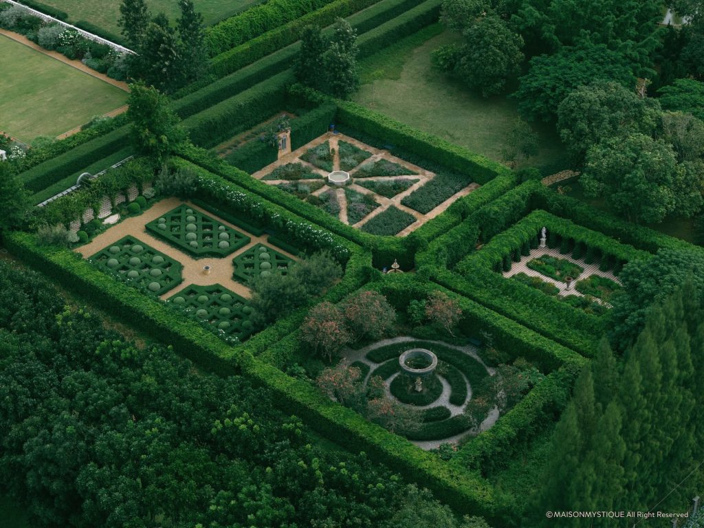 The Garden of Curiosity extends the story into nature. Designed as a living gallery, it features distinct landscapes such as Mahogany Lane, Roses Are Red Garden, and the Kitchen Garden, where fresh herbs and seasonal produce are harvested daily. Every turn reveals another vignette a bridge over a pond, a marble statue half-veiled in vines, or a secret gate leading to a hidden grove.