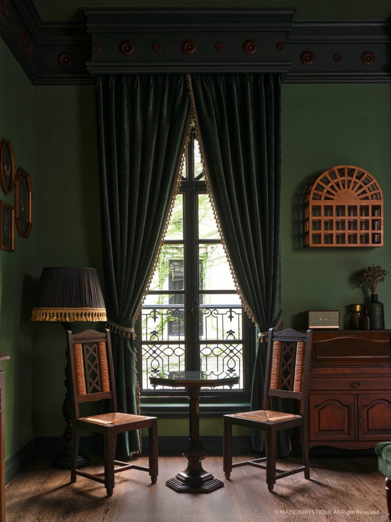 The Bibliothèque Émeraude, Maison Mystique’s library, is a refuge of dark green tones, jazz melodies, and soft lamplight. By day, it offers quiet contemplation among vintage books and artworks. By night, it transforms into a stylish bar serving martinis and classic cocktails, resonating with the soulful rhythm of live piano.