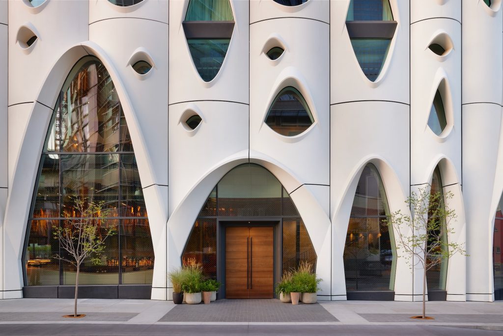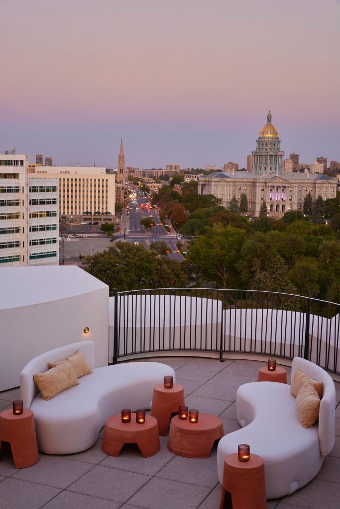 Its distinctive façade, rippled with eye-shaped windows, feels alive, a sculptural skin inspired by the markings left on the native aspen trunks as they shed their lower branches. These “eyes” soften the skyline and give guests unique views of the Rocky Mountains, the Colorado State Capitol, and Civic Center Park.