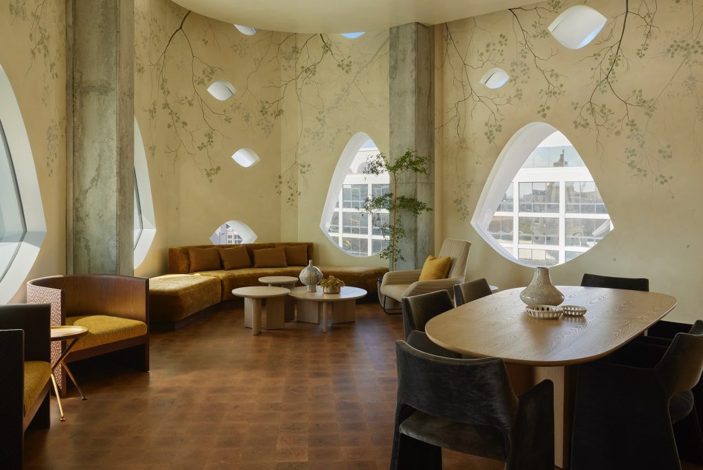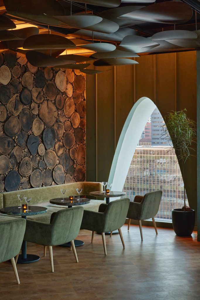 Inside, Wildman Chalmers Design and Fowler Architecture have created an interior that moves through an imagined woodland. The ground-floor lobby and Pasque restaurant form the “forest floor,” earthy, tactile, and warm, think reclaimed wood, clay tones, and a statement Reishi Tapestry made from the root structures of fungi.