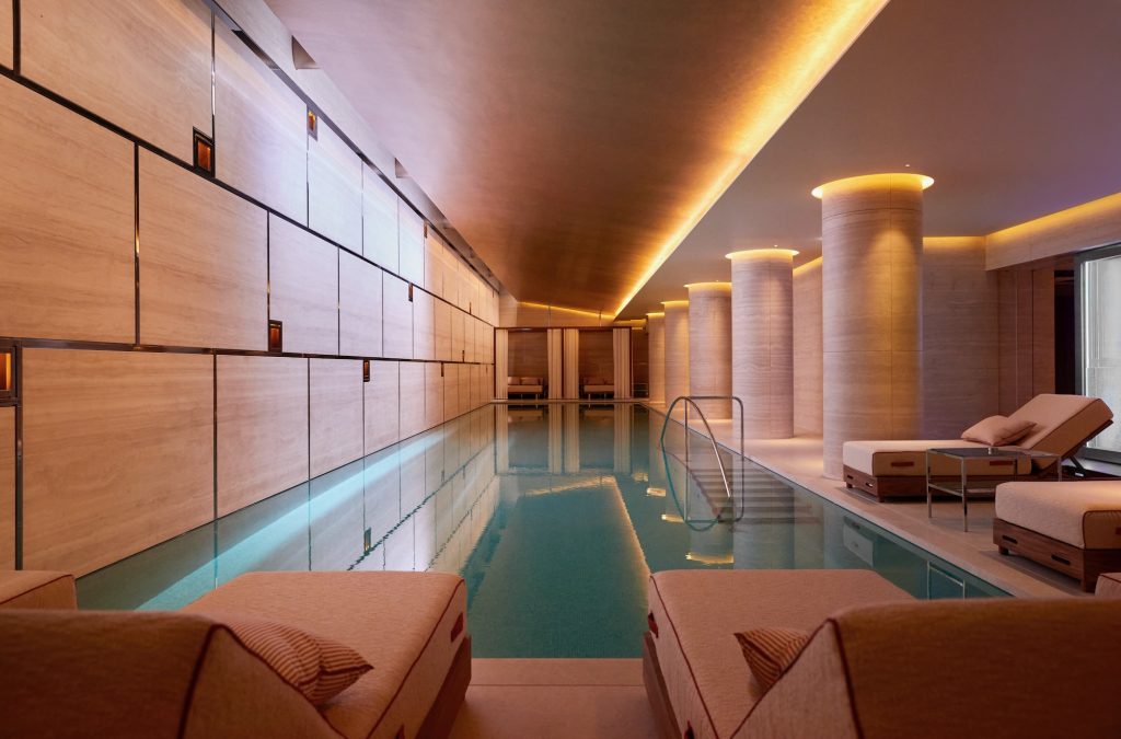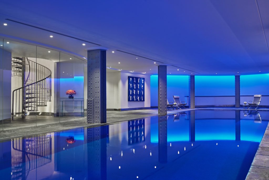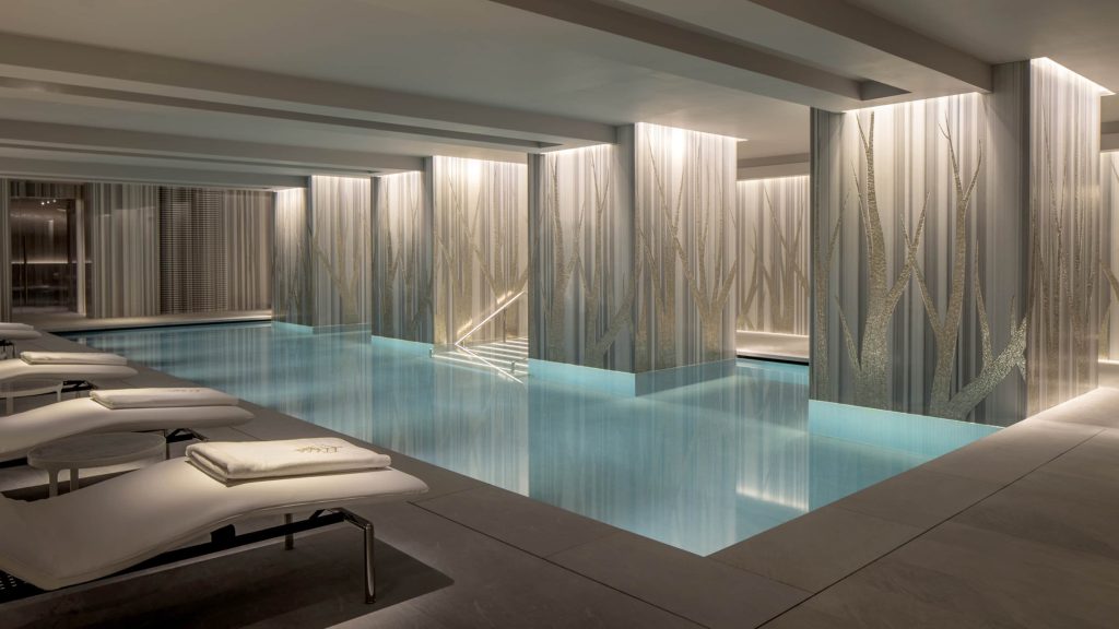 Mandarin Oriental Hyde Park’s spa is a good choice if you want a pool with a clear wellness angle rather than a simple hotel add-on. The 17 metre stainless steel pool has a neat, linear look and sits within a low lit space designed for steady lengths. Thermal facilities and treatment rooms stand just off the pool area and the spa team leans into targeted, medium-length rituals rather than overly long marathon sessions. With Hyde Park just outside, you can realistically pair an early run or walk with time in the pool and steam room and be back upstairs in time for breakfast.
