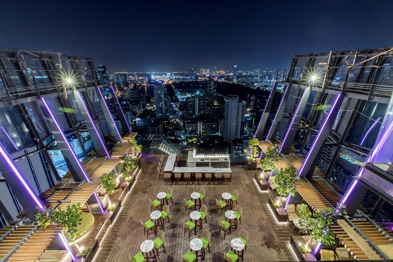 Occupying the 45th to the 49th floor of the Bangkok Marriott Hotel Sukhumvit, this bar is found in the uptown district of Thonglor. Drinks are served from 5 pm to 2 am, with food available from 6 pm to midnight. Share a charcuterie board laden with cheese, a portion of French fine de Claire oysters and a bucket of prawns. Or order main courses such as grilled lamb chops or Australian beef skewers, paired with tropical mocktails and cocktails packed with Thai ingredients. Each floor has a slightly different atmosphere and a blend of Thai pottery, plant-covered walls, wooden furnishings, bucket chairs and neon lighting.