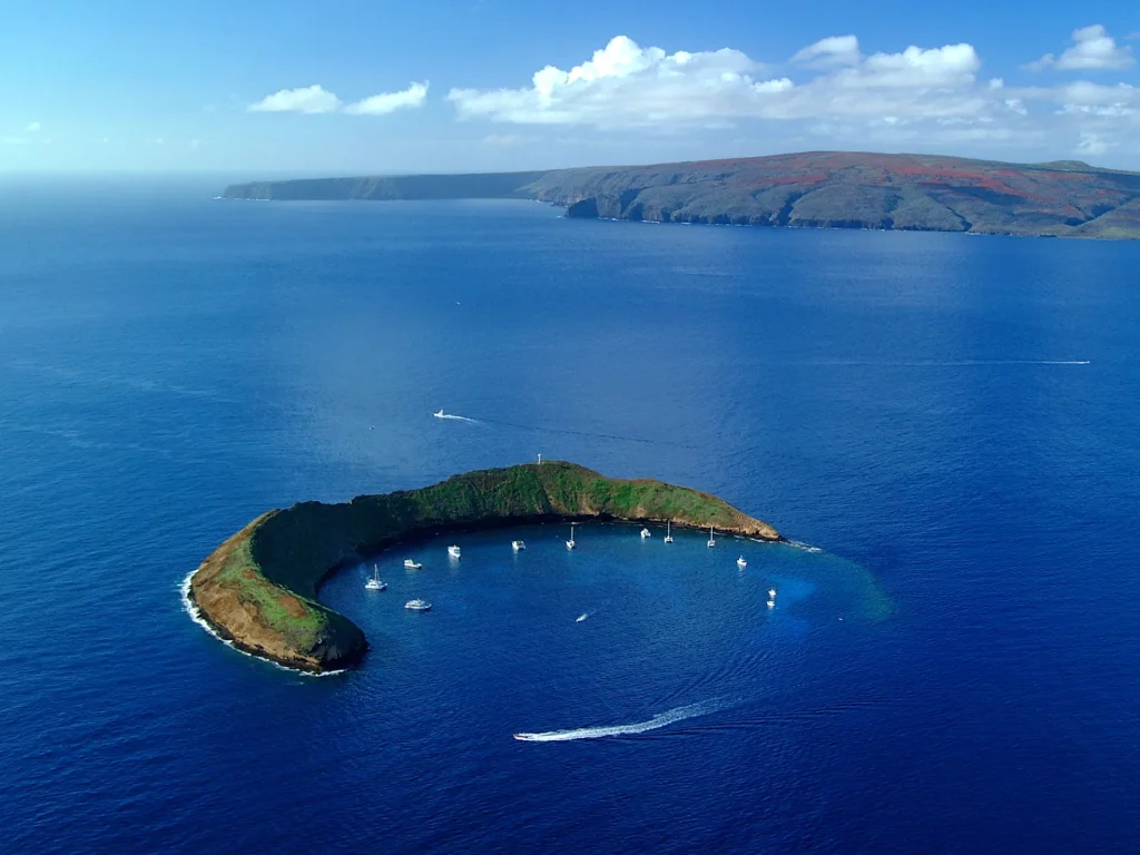 For one of the most unique snorkelling and diving experiences in Hawaii, charter a snorkel trip from Mā’alaea Harbour out to Molokini, a crescent-shaped, partially submerged volcanic crater that now functions as a protected marine reserve. The crater’s lip shields the inner waters from rough ocean swells, allowing a remarkable ecosystem to thrive in extraordinary clarity. Visibility here regularly reaches 150 feet on a clear day.